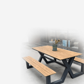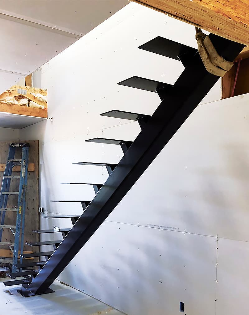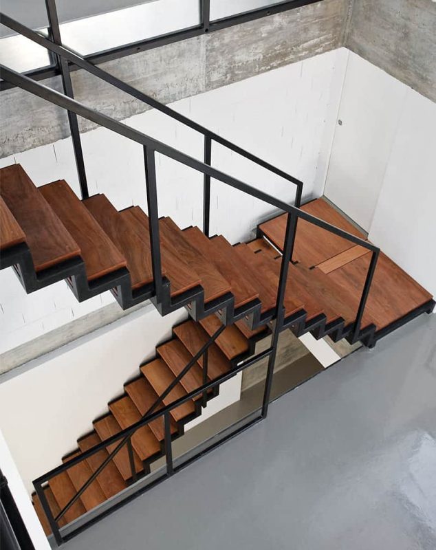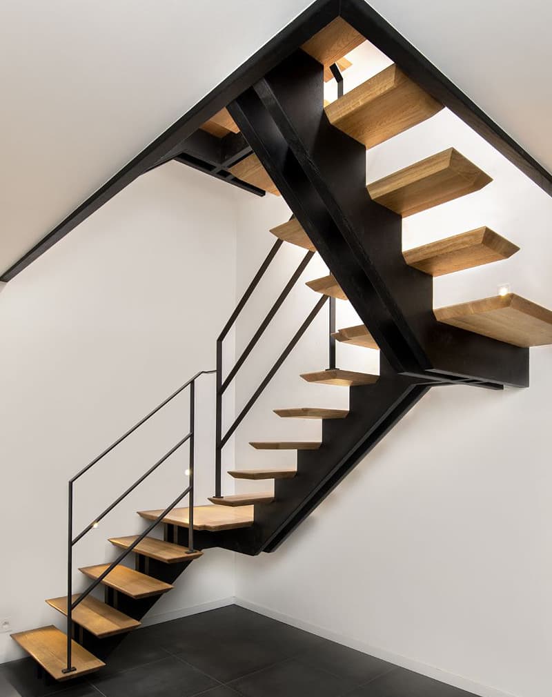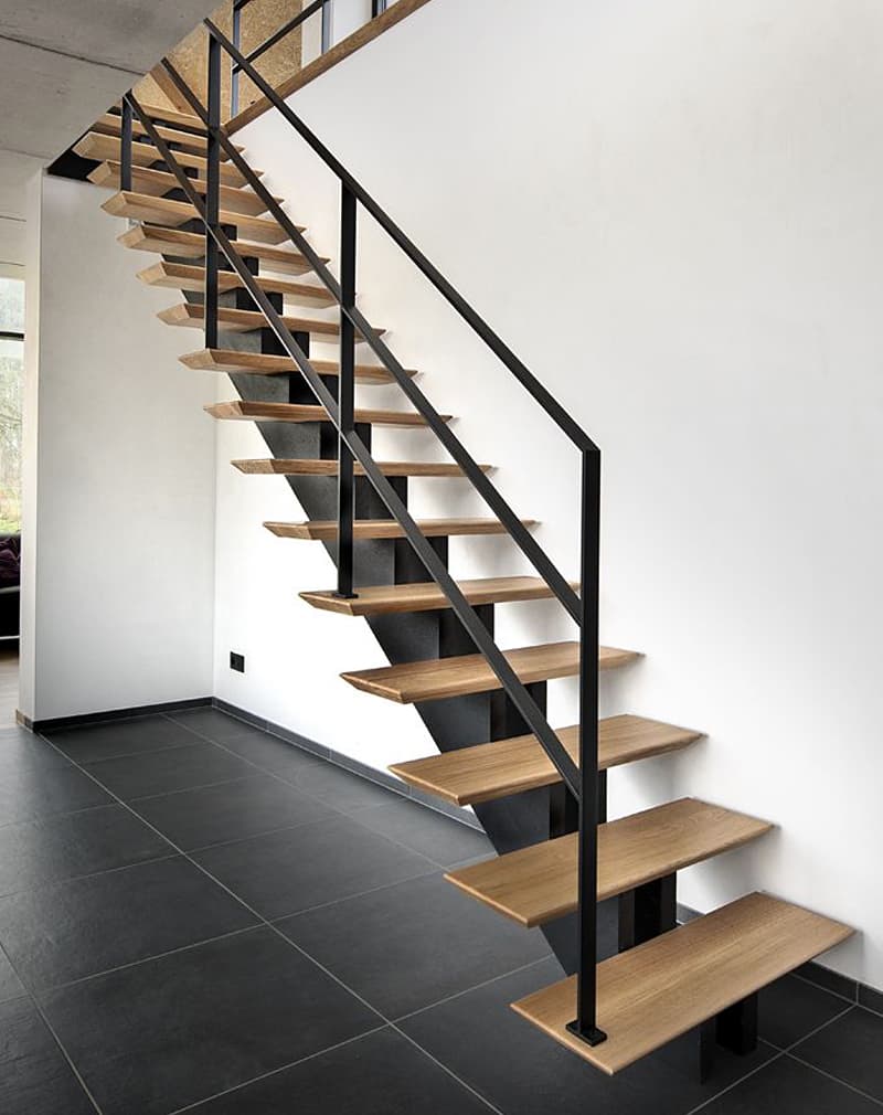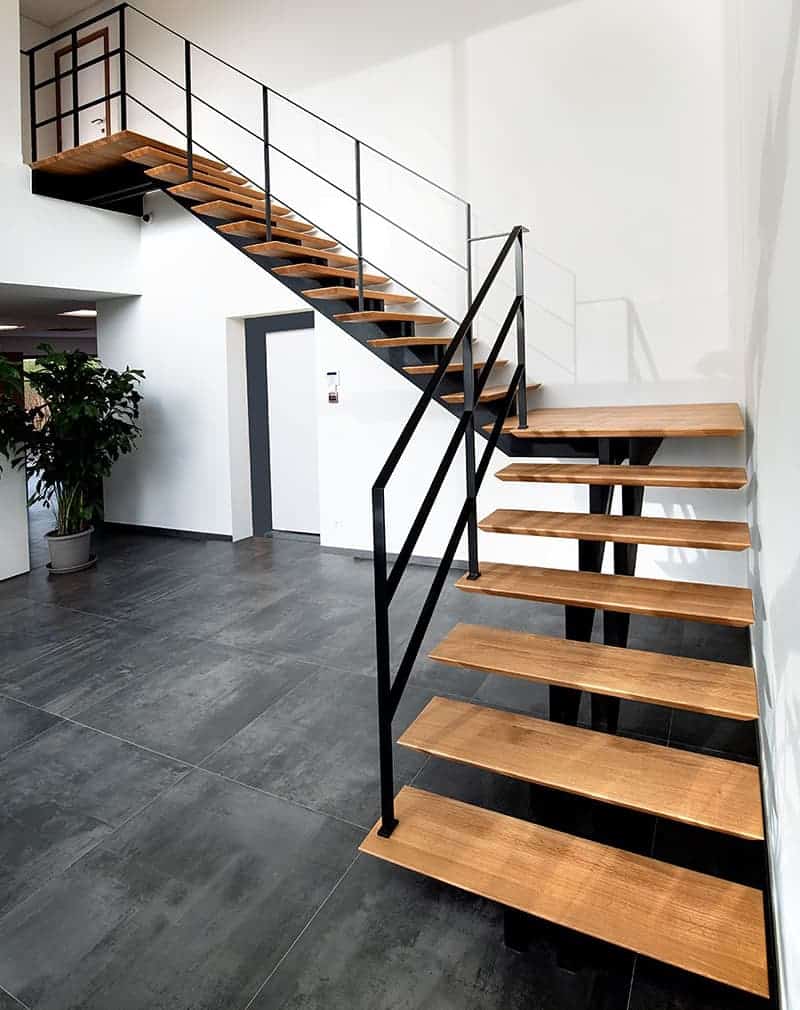 Лестница на ломаном косоуре из металлического профиля 40х40мм. Ступени дуб цельноламельный с минимальным количеством сучков, обработанный маслом и воском. Перила из профильной трубы 40×25мм. Покраска порошковая.