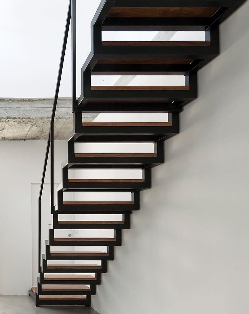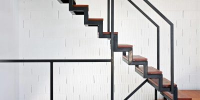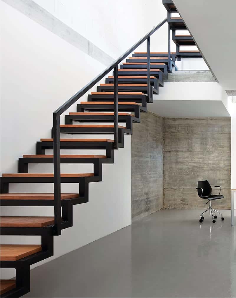 Лестница на ломаном косоуре из металлического профиля 40х40мм. Ступени дуб цельноламельный с минимальным количеством сучков, обработанный маслом и воском. Перила из профильной трубы 40×25мм. Покраска порошковая.