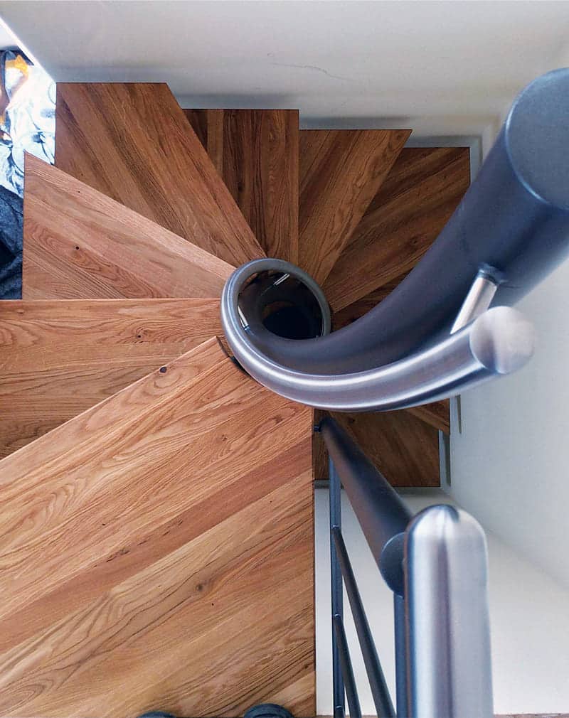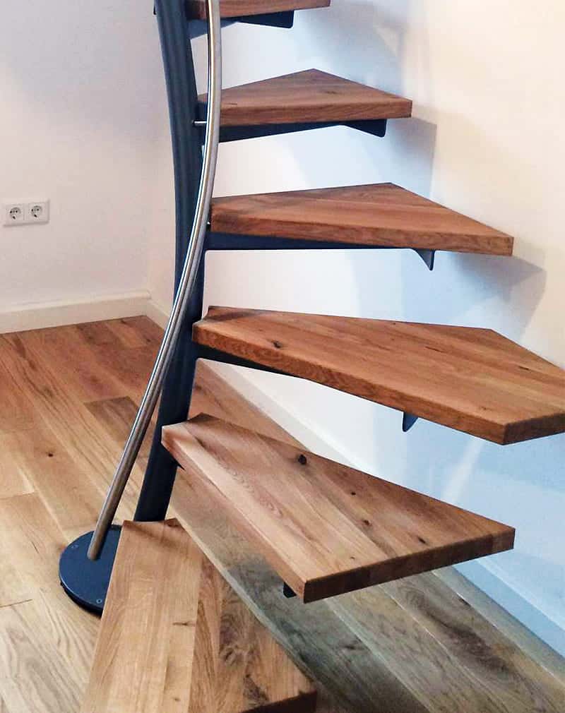 Лестница винтовая компактная. Каркас из металлической трубы ?100 мм, металлического профиля 40х20 и уголка 40х40. Ступени сосна клееная, обработанная маслом и воском. Внутренний поручень труба нержавеющая ?35.