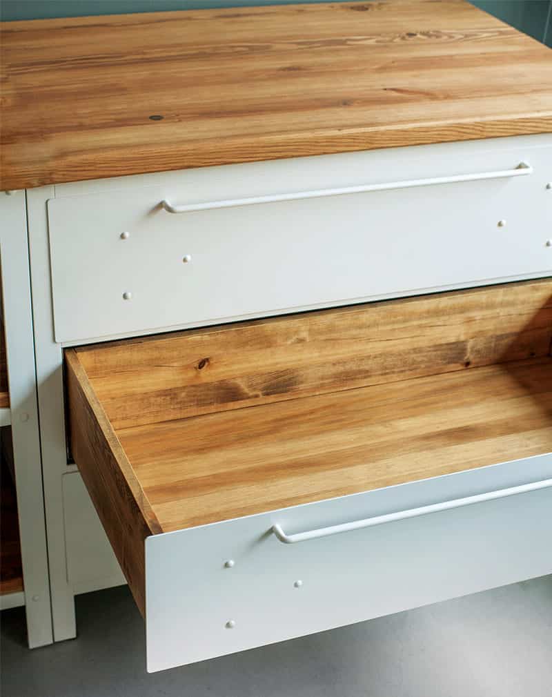 Ширина шкафа 50см. Внутреннее наполнение: 3 выдвижных ящика из клееной сосны. Все ящики оборудованы плавным доводчиком. Высота верхнего ящика 15см, среднего 20 см, нижнего 34см. Глубина ящиков 53см. Дерево обработано маслом и воском.