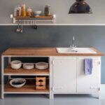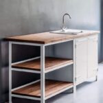 Кухонный напольный шкаф «Амбер Д»  сделан на основе шкафа «Амбер стандарт». Просто добавлена секция полок из клееной сосны 30мм. Основа шкафа из металлического листа 3мм.