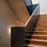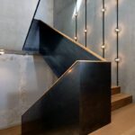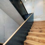 Перила сделаны из металлического листа 8мм. Применено чернение металла. Покрытие лак бесцветный. Поручень из дуба категории Премиум 60х40мм. Крепление скрытое в торец лестницы на химические анкера. Подойдут к хай-тек и лофт интерьерам.