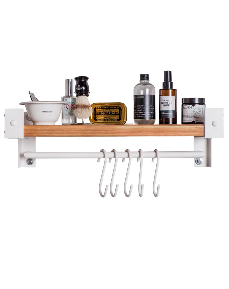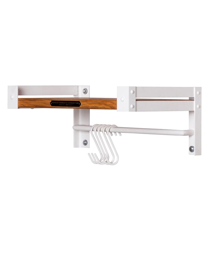 Кронштейны полностью сварные. Соединены стальным прочным рейлингом для подвеса кухонных принадлежностей. Стандартно имеют два цвета: белый и черный. Но вы можете выбрать любой другой цвет. А также другой вид дерева для полки.